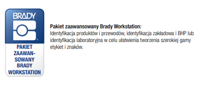 - Obsługiwane oprogramowanie Brady Workstation, sterownik do systemu Windows do obsługi oprogramowania zewnętrznego